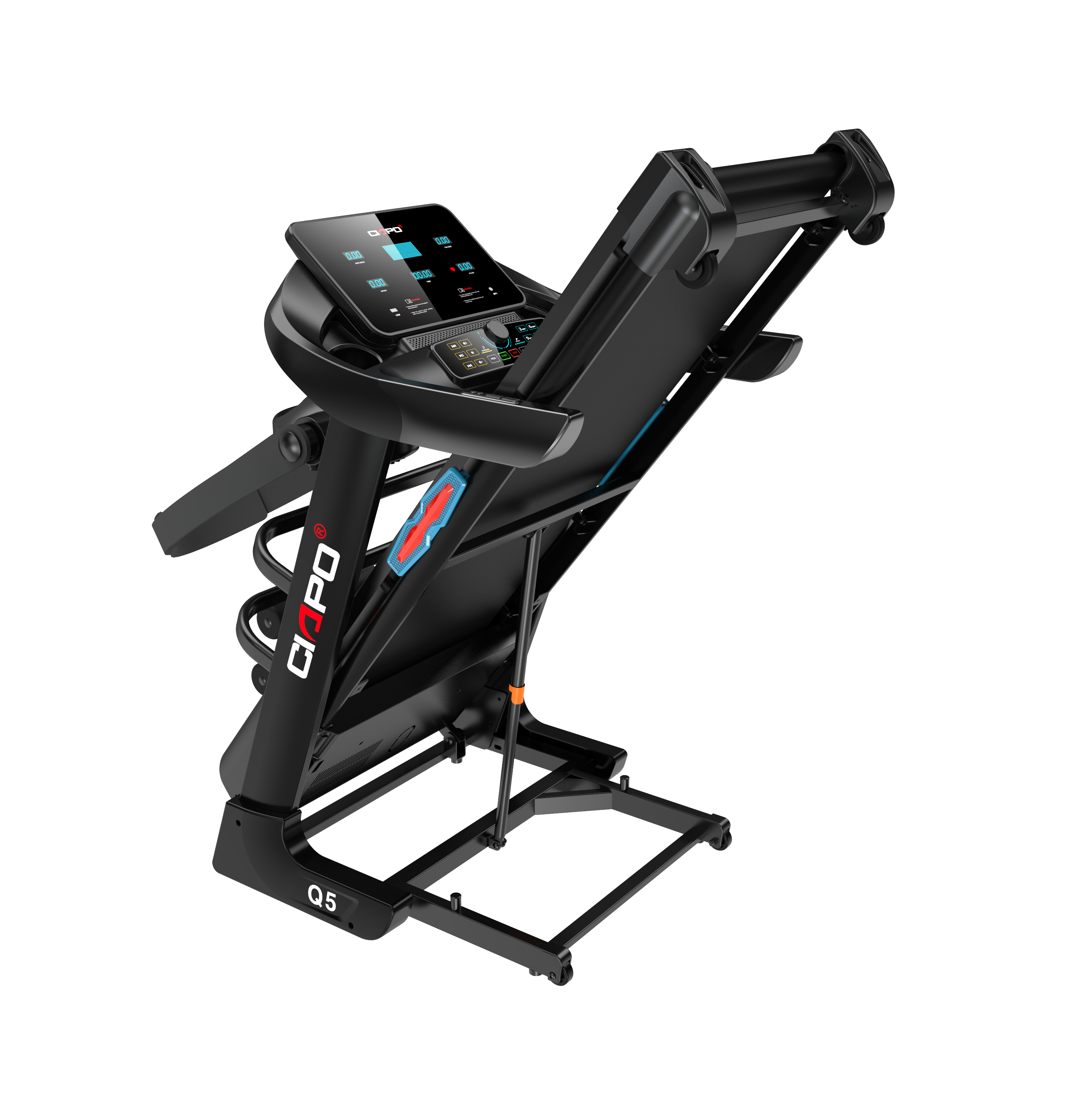 The Ciapo Q5 Treadmill is a foldable electric treadmill featuring a 2.5 HP brushless motor, a speed range of 0.8-15 km/h, and 0-15% automatic incline. It includes an LCD/LED console and Bluetooth connectivity.